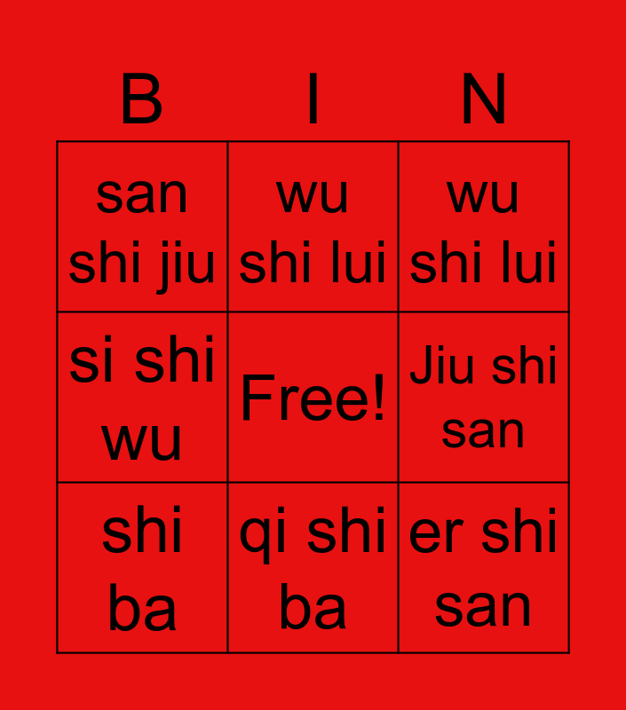 This bingo card has a free space and 8 words: Jiu shi san, wu shi lui, wu shi lui, shi ba, san shi jiu, er shi san, si shi wu and qi shi ba.