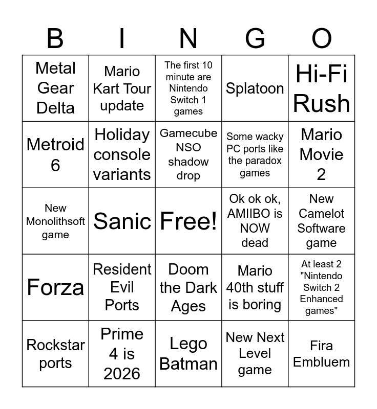 This bingo card has a free space and 24 words: Resident Evil Ports, Prime 4 is 2026, Gamecube NSO shadow drop, Rockstar ports, Hi-Fi Rush, Metal Gear Delta, Metroid 6, Mario Kart Tour update, Ok ok ok, AMIIBO is NOW dead, Doom the Dark Ages, Some wacky PC ports like the paradox games, New Monolithsoft game, Mario 40th stuff is boring, At least 2 "Nintendo Switch 2 Enhanced games", Holiday console variants, New Next Level game, New Camelot Software game, The first 10 minute are Nintendo Switch 1 games, Mario Movie 2, Sanic, Fira Embluem, Forza, Splatoon and Lego Batman.