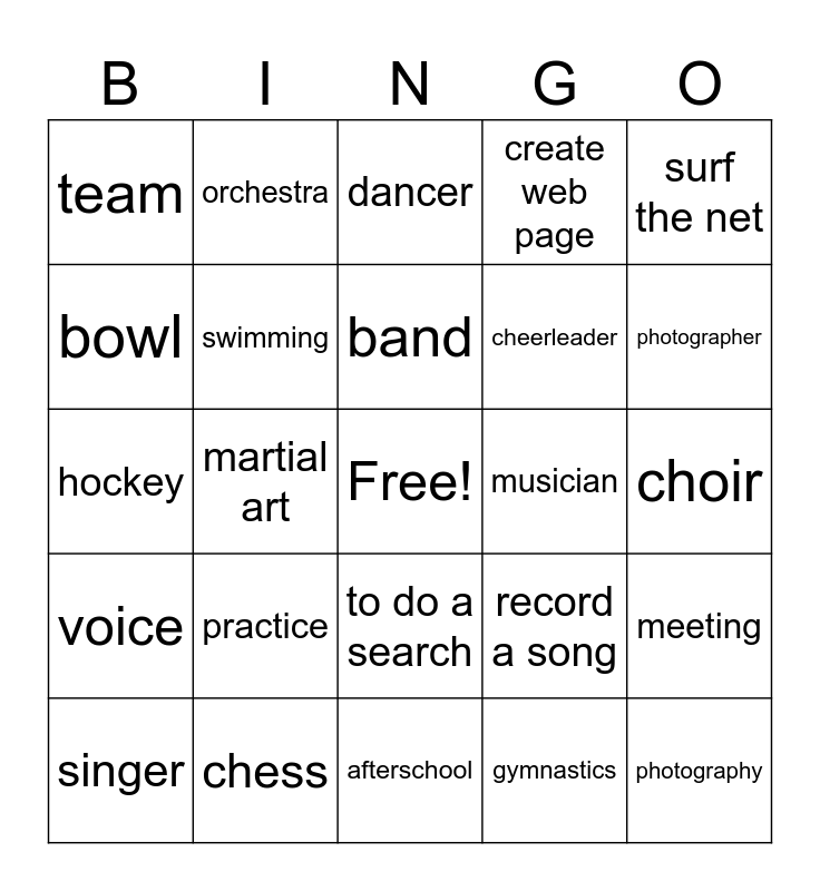 This bingo card has a free space and 24 words: practice, chess, band, singer, surf the net, team, bowl, orchestra, musician, to do a search, cheerleader, hockey, record a song, meeting, swimming, gymnastics, choir, dancer, photographer, martial art, photography, voice, create web page and afterschool.
