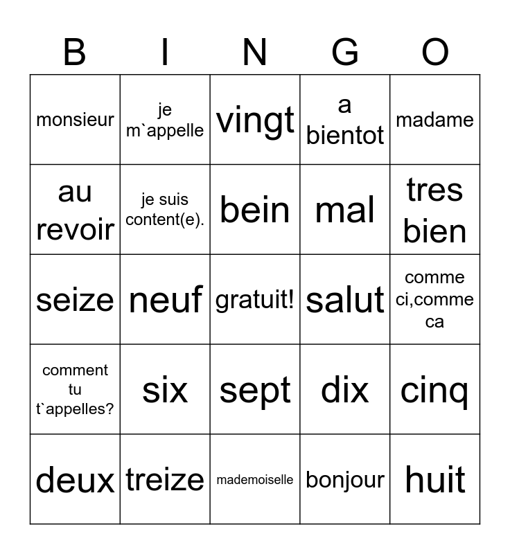 This bingo card has a free space and 24 words: six, treize, bein, deux, madame, monsieur, au revoir, je m`appelle, salut, sept, mal, seize, dix, cinq, je suis content(e)., bonjour, comme ci,comme ca, vingt, tres bien, neuf, huit, comment tu t`appelles?, a bientot and mademoiselle.