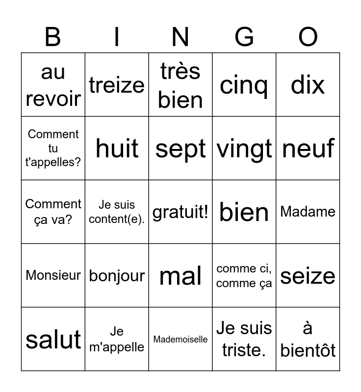 This bingo card has a free space and 24 words: bonjour, Je m'appelle, sept, salut, dix, au revoir, Comment tu t'appelles?, treize, bien, mal, vingt, Comment ça va?, comme ci, comme ça, seize, huit, Je suis triste., Madame, très bien, neuf, Je suis content(e)., à bientôt, Monsieur, cinq and Mademoiselle.