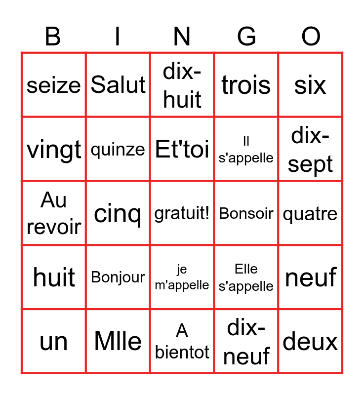 This bingo card has a free space and 24 words: Bonjour, Mlle, Et'toi, un, six, seize, vingt, Salut, Bonsoir, je m'appelle, Il s'appelle, Au revoir, Elle s'appelle, neuf, quinze, dix-neuf, quatre, dix-huit, dix-sept, cinq, deux, huit, trois and A bientot.