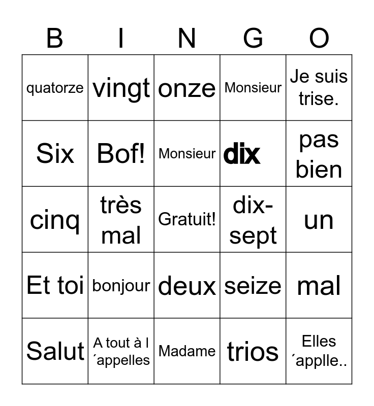 This bingo card has a free space and 24 words: bonjour, A tout à l´appelles, Monsieur, Salut, Je suis trise., quatorze, Six, vingt, dix-sept, deux, dix, cinq, seize, mal, Bof!, trios, un, onze, pas bien, très mal, Elles´applle.., Et toi, Monsieur and Madame.