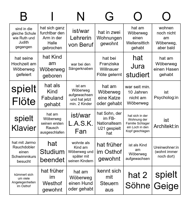 This bingo card has 36 words: hat früher im Osthof gewohnt, wohnte als Kind am Wöberweg und später mit seinen Kindern, kennt sich mit Steuern aus, hat seine Hochzeit am Wöberweg gefeiert, spielt Klavier, hat am Wöberweg eine Katze oder gehabt, hat Kind am Wöberweg geboren, hat am Wöberweg einen Hund oder gehabt, hat am Wöberweg einen Wellensittich gehabt, ist als Kind am Wöberweg aufgewachsen, hat am Wöberweg einen Hasen gehabt, hat in zwei Wohnungen gewohnt, Ureinwohner:in (wohnt immer noch dort), hat als Kind Fabuland gehabt, hat bei Franziska Willnauer Flöte gelernt, sind in die gleiche Schule wie Ruth und Judith gegangen, hat mit Jarmo Rauchdobler einen Schwimmkurs besucht, war seit min. 10 Jahren nicht am Wöberweg, spielt Flöte, ist/war Lehrerin von Beruf, ist am Wöberweg aufgewachsen und hat jetzt min. 2 Kinder, hat am Wöberweg seinen ersten Rausch ausgeschlafen, hat Sohn, der im FB-Nationalteam U21 gespielt hat, ist/war L.A.S.K. Fan, hat sich in der Wohnung der Familie Schlager ein Loch in den Kopf geschlagen, hat sich ganz furchtbar den Arm in der Halle gebrochen, hat Jura studiert, hat früher im Westhof gewohnt, war bei den Sängerknaben, wohnen noch nicht am Wöberweg, aber bald, spielt Geige, kümmert sich um viele Angelegenheiten im Osthof, ist Architekt:in, ist Psycholog:in, hat Studium beendet and hat 2 Söhne.