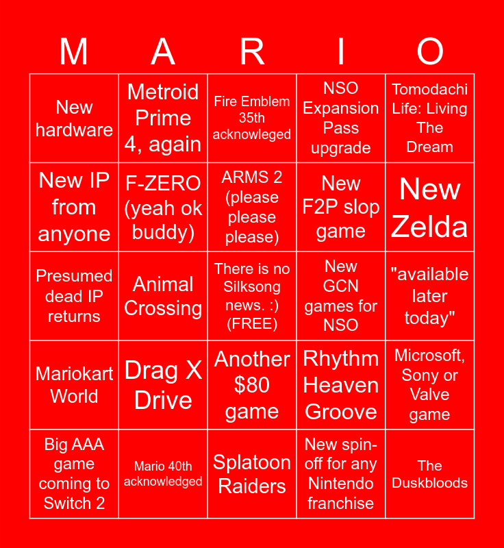 This bingo card has a free space and 24 words: Drag X Drive, Mario 40th acknowledged, ARMS 2 (please please please), Big AAA game coming to Switch 2, Tomodachi Life: Living The Dream, New hardware, New IP from anyone, Metroid Prime 4, again, New GCN games for NSO, Another $80 game, New F2P slop game, Presumed dead IP returns, Rhythm Heaven Groove, Microsoft, Sony or Valve game, F-ZERO (yeah ok buddy), New spin-off for any Nintendo franchise, "available later today", Fire Emblem 35th acknowleged, New Zelda, Animal Crossing, The Duskbloods, Mariokart World, NSO Expansion Pass upgrade and Splatoon Raiders.