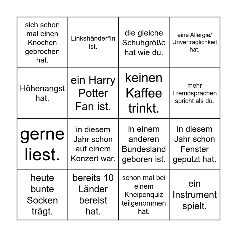This bingo card has 32 words: ein Tattoo hat., schon in Skandinavien war., in diesem Jahr schon Fenster geputzt hat., schon mal mit Tine / Tommy im Urlaub war., ein Instrument spielt., keinen Kaffee trinkt., Höhenangst hat., DRK-Mitglied ist., Linkshänder*in ist., im gleichen Monat Geburtstag hat wie du., mehr Fremdsprachen spricht als du., die gleiche Schuhgröße hat wie du., mehr als 15 Brettspiele besitzt., in einem Beruf mit Kindern/ Jugendlichen arbeitet., bereits 10 Länder bereist hat., eine Katze hat., schon mal Surströmming gegessen hat., in einem anderen Bundesland geboren ist., eine weitere Anreise hatte als du., ein Handwerk gelernt hat., kein Instagram hat., mehr als 10 Zimmerpflanzen besitzt., schon mal bei einem Kneipenquiz teilgenommen hat., schon mal League of Legends gespielt hat., heute bunte Socken trägt., eine Allergie/ Unverträglichkeit hat., gerne liest., ein Harry Potter Fan ist., sich schon mal einen Knochen gebrochen hat., in diesem Jahr Gemüse geerntet hat., vegan/ vegetarisch ist. and in diesem Jahr schon auf einem Konzert war..