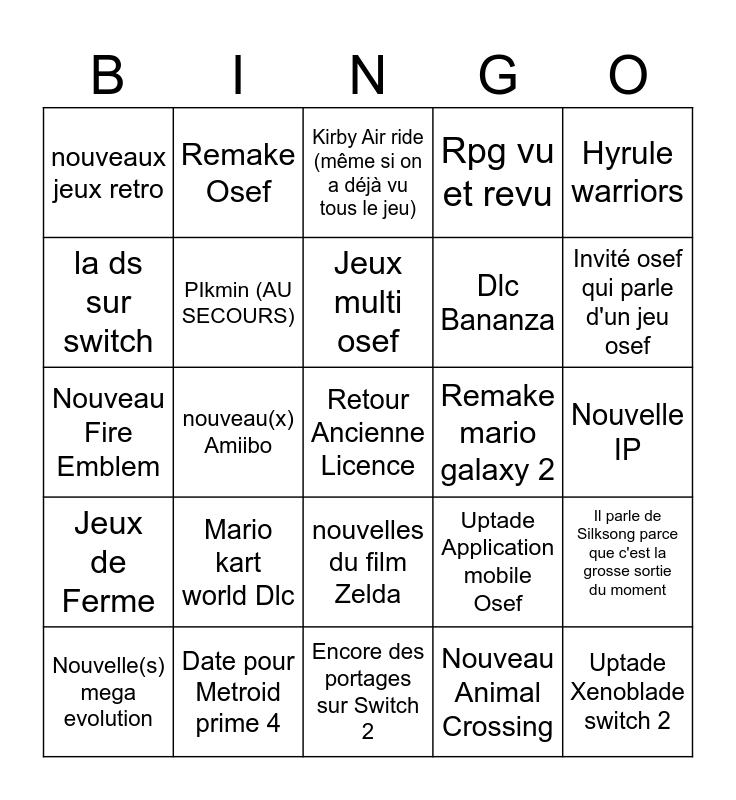 This bingo card has a free space and 24 words: Mario kart world Dlc, Date pour Metroid prime 4, Jeux multi osef, Nouvelle(s) mega evolution, Hyrule warriors, nouveaux jeux retro, la ds sur switch, Remake Osef, Remake mario galaxy 2, nouvelles du film Zelda, Dlc Bananza, Nouveau Fire Emblem, Uptade Application mobile Osef, Il parle de Silksong parce que c'est la grosse sortie du moment, PIkmin (AU SECOURS), Nouveau Animal Crossing, Nouvelle IP, Kirby Air ride (même si on a déjà vu tous le jeu), Invité osef qui parle d'un jeu osef, nouveau(x) Amiibo, Uptade Xenoblade switch 2, Jeux de Ferme, Rpg vu et revu and Encore des portages sur Switch 2.