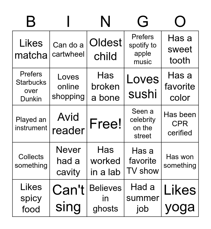 This bingo card has a free space and 75 words: Owns a cat, Likes mayo, Oldest child, Has 3 siblings, Studied abroad, Born in NJ, Gone to the Eras Tour, Lived outside northeast, Prefers Coffee over Tea, Winter birthday, Economics major, Loves summer, Has broken a bone, Prefers Starbucks over Dunkin, Marketing major, Avid reader, Was in a sorority, Likes yoga, Played volleyball, Has a sweet tooth, Visited a national park, Played an instrument, Loves online shopping, Can do a cartwheel, Prefers spotify to apple music, Has a favorite number, Country fan, Always cold, Been to 8+ countries, Loves diet coke, Has a favorite board game, Sports fan, Worked in fitness, Has a favorite TV show, Has a favorite color, Loves sushi, Likes olives, Likes astrology, Has been CPR cerified, Had a summer job, Likes pickles, Prefers window seat, Prefers cold drinks, Has run a 5K, Has a scar, Left handed, Likes spicy food, Likes matcha, Wears contact lenses, Loves to walk, Has a sister, Has worked in a lab, Helped build a school, 100+ hours of community service, Has been to a football game, Plays pickleball, Worked in food service, Prefers Trader Joe's, Has a sibling under 13, Likes the ocean, Never had a cavity, Has seen Star Wars, Likes reality TV, Never been skydiving, Likes podcasts, Seen a celebrity on the street, Never had a speeding ticket, Been on a cruise, Likes pepperoni on pizza, Has won something, Collects something, Can't sing, Has verizon, Believes in ghosts and Has skipped class.