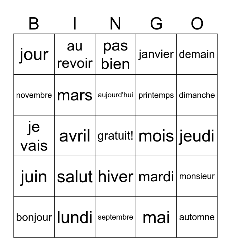 This bingo card has a free space and 24 words: salut, lundi, aujourd'hui, bonjour, demain, jour, novembre, au revoir, mois, hiver, printemps, je vais, mardi, monsieur, mars, mai, jeudi, pas bien, dimanche, avril, automne, juin, janvier and septembre.