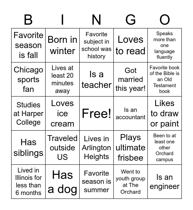 This bingo card has a free space and 24 words: Traveled outside US, Has a dog, Is a teacher, Lived in Illinois for less than 6 months, Speaks more than one language fluently, Favorite season is fall, Chicago sports fan, Born in winter, Is an accountant, Lives in Arlington Heights, Got married this year!, Studies at Harper College, Plays ultimate frisbee, Been to at least one other Orchard campus, Lives at least 20 minutes away, Went to youth group at The Orchard, Likes to draw or paint, Favorite subject in school was history, Favorite book of the Bible is an Old Testament book, Loves ice cream, Is an engineer, Has siblings, Loves to read and Favorite season is summer.