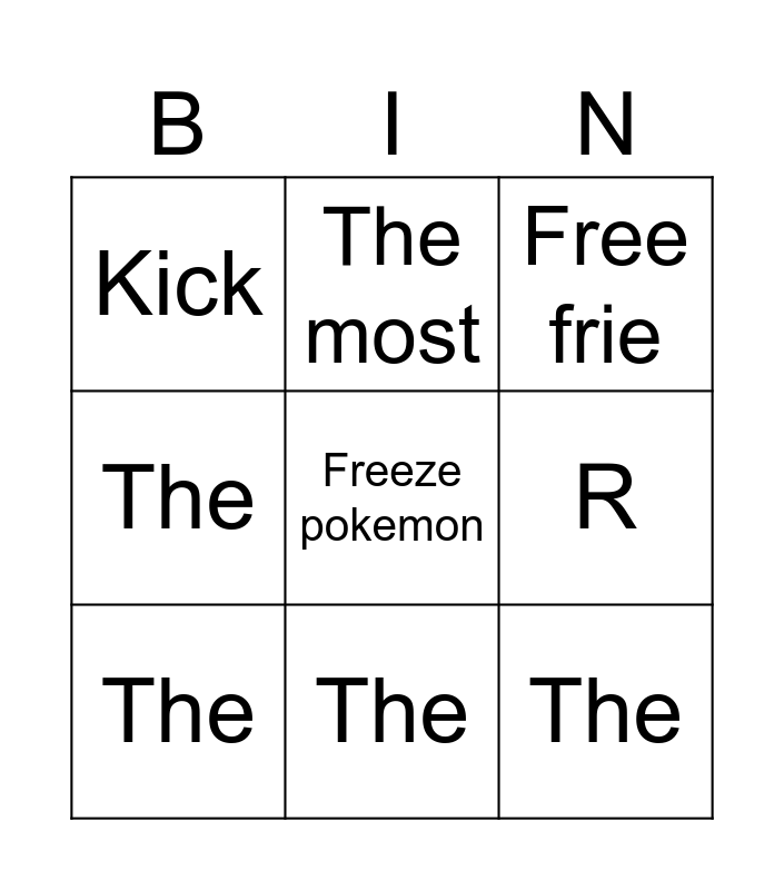 This bingo card has a free space and 8 words: R, Free frie, The most, The, Kick, The, The and The.