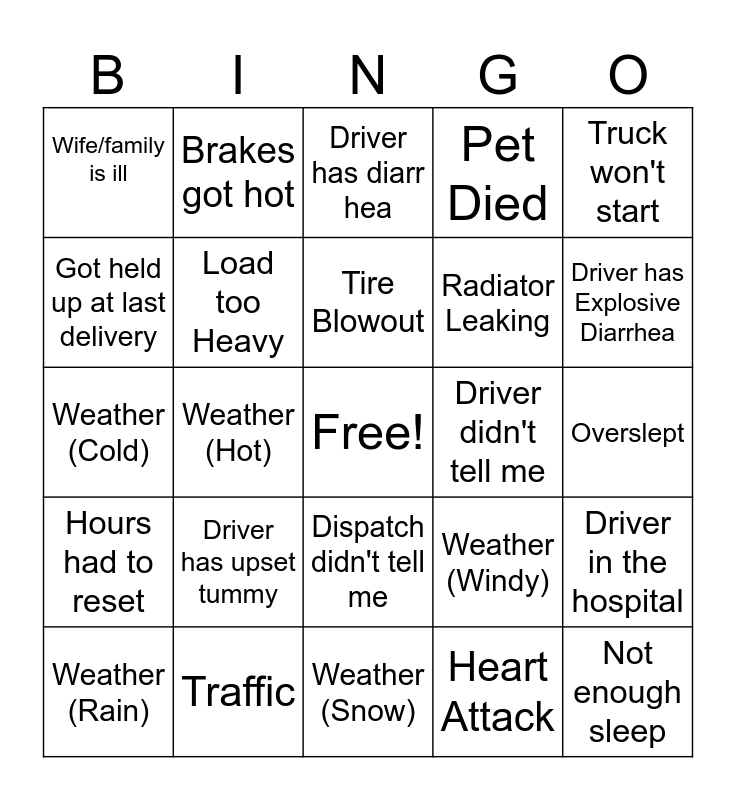 This bingo card has a free space and 24 words: Driver has upset tummy, Traffic, Tire Blowout, Weather (Rain), Truck won't start, Wife/family is ill, Got held up at last delivery, Brakes got hot, Driver didn't tell me, Dispatch didn't tell me, Radiator Leaking, Weather (Cold), Weather (Windy), Driver in the hospital, Load too Heavy, Heart Attack, Overslept, Driver has diarr hea, Driver has Explosive Diarrhea, Weather (Hot), Not enough sleep, Hours had to reset, Pet Died and Weather (Snow).