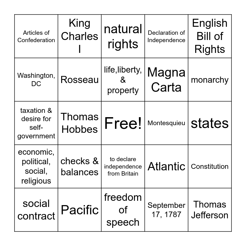 This bingo card has a free space and 35 words: life,liberty, & pursuit of happiness, July 4, 1776, John Locke, Rosseau, to declare independence from Britain, Declaration of Independence, Washington, DC, Mississippi, life,liberty, & property, Voltaire, taxation & desire for self-government, English Bill of Rights, all men are created equal, Common Sense, Articles of Confederation, Montesquieu, September 17, 1787, Thomas Hobbes, economic, political, social, religious, Thomas Jefferson, Atlantic, social contract, Constitution, Pacific, natural rights, monarchy, couldn't enforce laws, Thomas Paine, Magna Carta, states, right to trial by jury, freedom of speech, checks & balances, King Charles I and Oliver Cromwell.