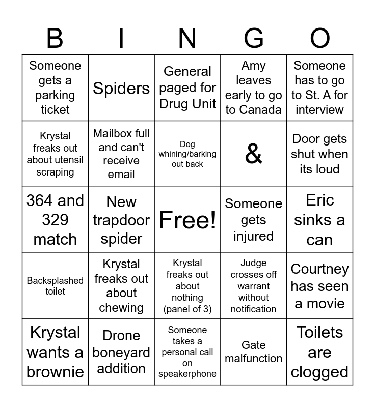 This bingo card has a free space and 24 words: Krystal freaks out about chewing, Drone boneyard addition, Dog whining/barking out back, Krystal wants a brownie, Someone has to go to St. A for interview, Someone gets a parking ticket, Krystal freaks out about utensil scraping, Spiders, Someone gets injured, Krystal freaks out about nothing (panel of 3), &, 364 and 329 match, Judge crosses off warrant without notification, Courtney has seen a movie, Mailbox full and can't receive email, Gate malfunction, Eric sinks a can, General paged for Drug Unit, Door gets shut when its loud, New trapdoor spider, Toilets are clogged, Backsplashed toilet, Amy leaves early to go to Canada and Someone takes a personal call on speakerphone.