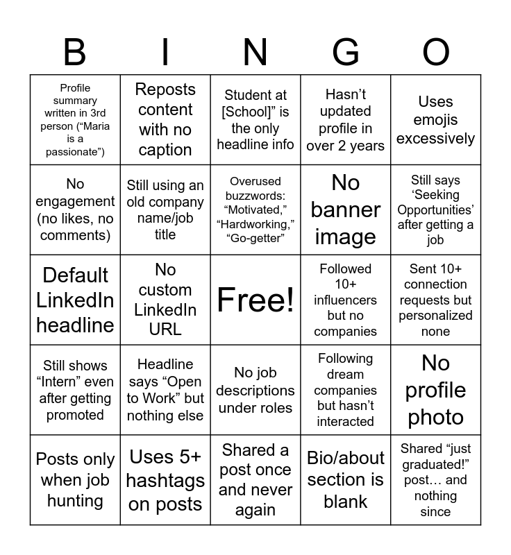 This bingo card has a free space and 24 words: Headline says “Open to Work” but nothing else, Uses 5+ hashtags on posts, Overused buzzwords: “Motivated,” “Hardworking,” “Go-getter”, Posts only when job hunting, Uses emojis excessively, Profile summary written in 3rd person (“Maria is a passionate”), No engagement (no likes, no comments), Reposts content with no caption, Followed 10+ influencers but no companies, No job descriptions under roles, No banner image, Default LinkedIn headline, Following dream companies but hasn’t interacted, No profile photo, Still using an old company name/job title, Bio/about section is blank, Sent 10+ connection requests but personalized none, Student at [School]” is the only headline info, Still says ‘Seeking Opportunities’ after getting a job, No custom LinkedIn URL, Shared “just graduated!” post… and nothing since, Still shows “Intern” even after getting promoted, Hasn’t updated profile in over 2 years and Shared a post once and never again.