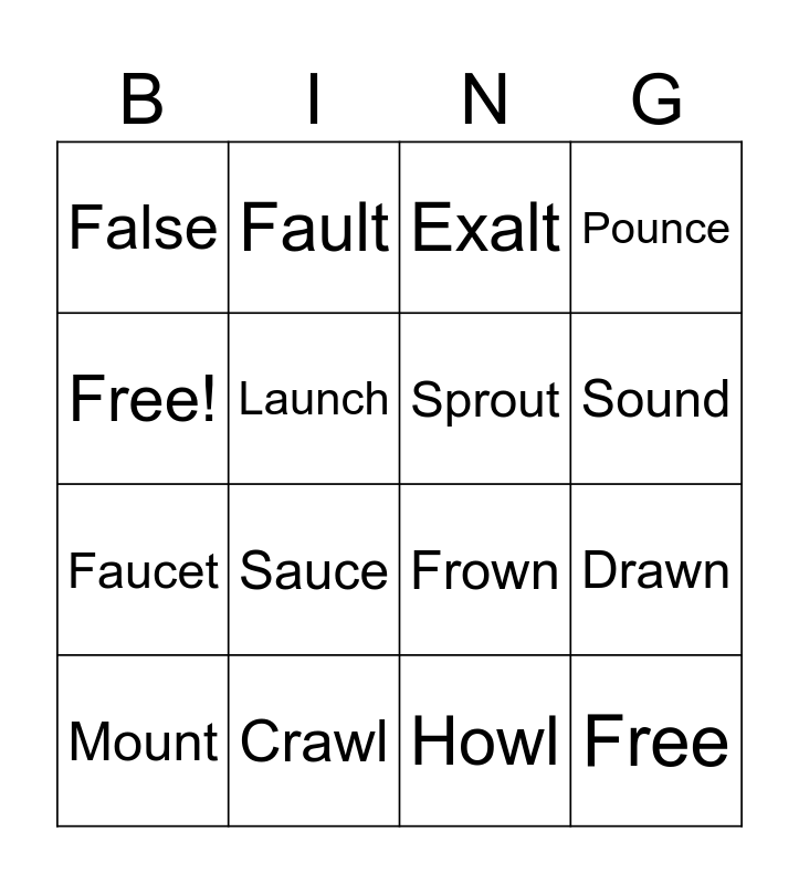 This bingo card has 16 words: Crawl, Drawn, Exalt, False, Faucet, Fault, Frown, Howl, Free!, Launch, Mount, Pounce, Sauce, Sound, Sprout and Free.