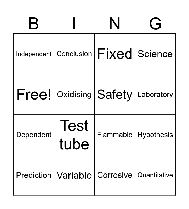 This bingo card has 16 words: Variable, Hypothesis, Fixed, Independent, Dependent, Conclusion, Flammable, Corrosive, Free!, Oxidising, Prediction, Science, Test tube, Laboratory, Safety and Quantitative.