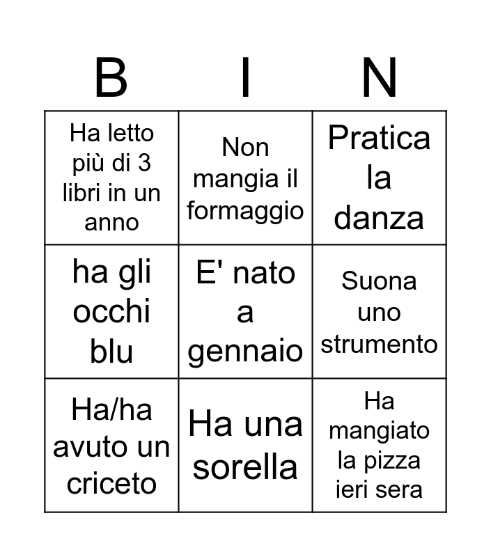 This bingo card has 24 words: Non ha mai viaggiato su un aereo, Ha due fratelli maschi, Ha una sorella, Ama leggere, E' nato a gennaio, Ha letto più di 3 libri in un anno, Suona uno strumento, Non mangia il formaggio, Ha gli occhi verdi, E' stato in Francia, Ha mangiato la pizza ieri sera, sa suonare il pianoforte, Ha un gatto, E' stato a teatro, Ha/ha avuto un criceto, gli/le piace scrivere, Pratica come sport tennis, Pratica la danza, Pratica come sport calcio, Ama i broccoli, e' stato/a a un concerto, va a scuola a piedi, ha gli occhi blu and Sa cucinare.