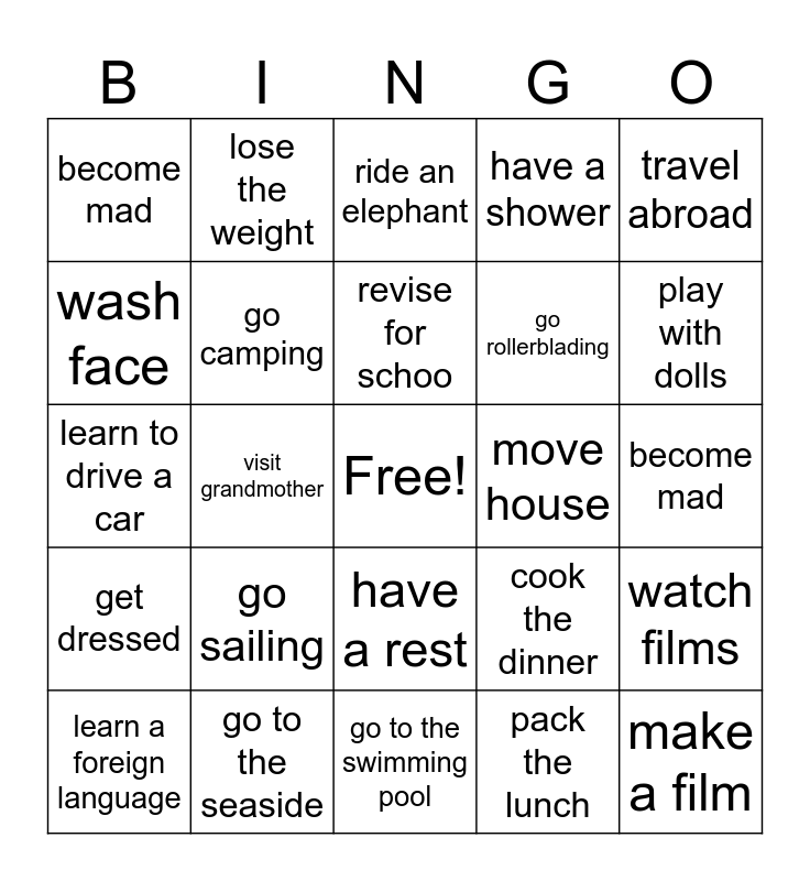 This bingo card has a free space and 24 words: go sailing, go to the seaside, revise for schoo, learn a foreign language, travel abroad, become mad, wash face, lose the weight, move house, have a rest, go rollerblading, learn to drive a car, cook the dinner, watch films, go camping, pack the lunch, become mad, ride an elephant, play with dolls, visit grandmother, make a film, get dressed, have a shower and go to the swimming pool.