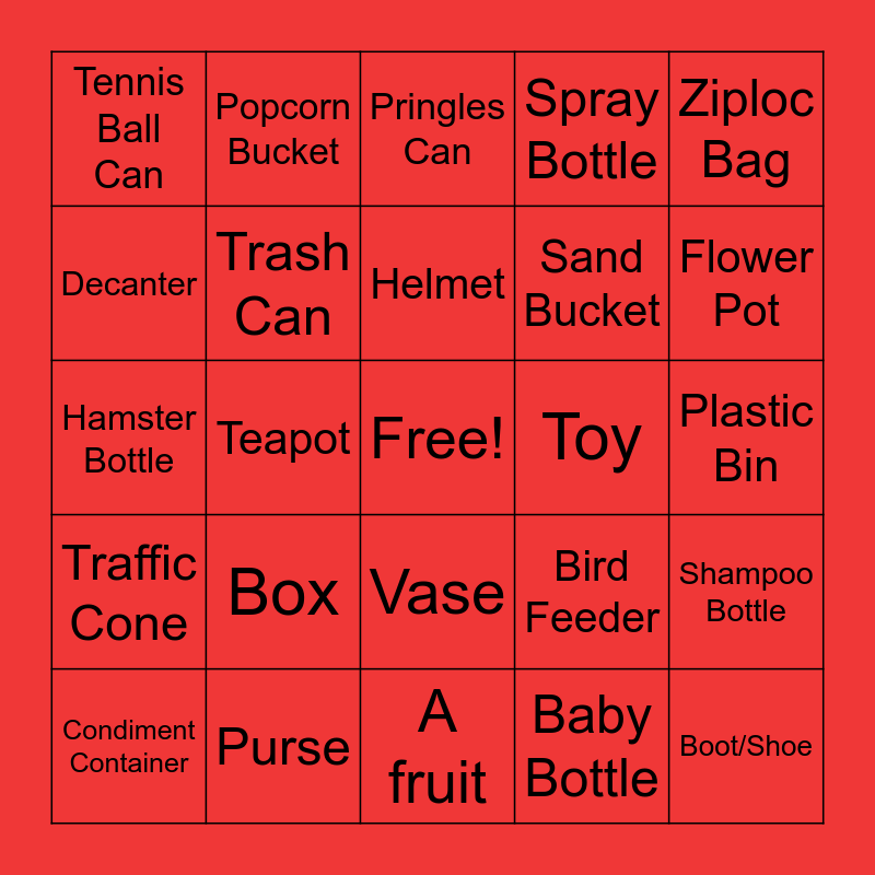 This bingo card has a free space and 44 words: Watering Can, Boot/Shoe, Blender, Condiment Container, Ice Cream Container, Baby Bottle, Pringles Can, Trophy, Ziploc Bag, Purse, Spray Bottle, Toy, Vase, Box, Coffee Pot/Carafe, A fruit, Potty, Hamster Bottle, Bucket, Flower Pot, Popcorn Bucket, Fishbowl, Piggy Bank, Tennis Ball Can, Lightbulb, Plastic Bin, Squirt Gun, IV Bag, Bird Feeder, Traffic Cone, Lantern, Shampoo Bottle, Pet Bowl, Coffee Tin, Teapot, Soap Dispenser, Gas Can, Bubbles Container, Helmet, Decanter, Sand Bucket, Hat, Trash Can and Soup Can.