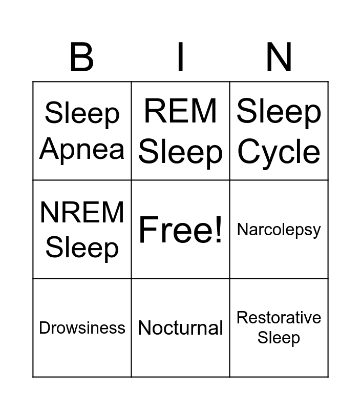 This bingo card has a free space and 8 words: Narcolepsy, Sleep Cycle, REM Sleep, Drowsiness, Sleep Apnea, Restorative Sleep, NREM Sleep and Nocturnal.