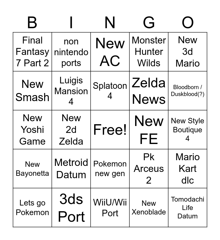 This bingo card has a free space and 24 words: Metroid Datum, 3ds Port, Splatoon 4, Lets go Pokemon, New 3d Mario, Final Fantasy 7 Part 2, New Smash, non nintendo ports, New FE, Pokemon new gen, Zelda News, New Yoshi Game, Pk Arceus 2, Mario Kart dlc, Luigis Mansion 4, New Xenoblade, New Style Boutique 4, New AC, Bloodborn / Duskblood(?), New 2d Zelda, Tomodachi Life Datum, New Bayonetta, Monster Hunter Wilds and WiiU/Wii Port.