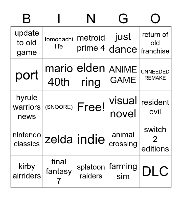 This bingo card has a free space and 24 words: kirby airriders, zelda, elden ring, farming sim, return of old franchise, update to old game, tomodachi life, metroid prime 4, visual novel, resident evil, hyrule warriors news, mario 40th, animal crossing, switch 2 editions, port, final fantasy 7, splatoon raiders, just dance, UNNEEDED REMAKE, nintendo classics, (SNOORE), indie, ANIME GAME and DLC.