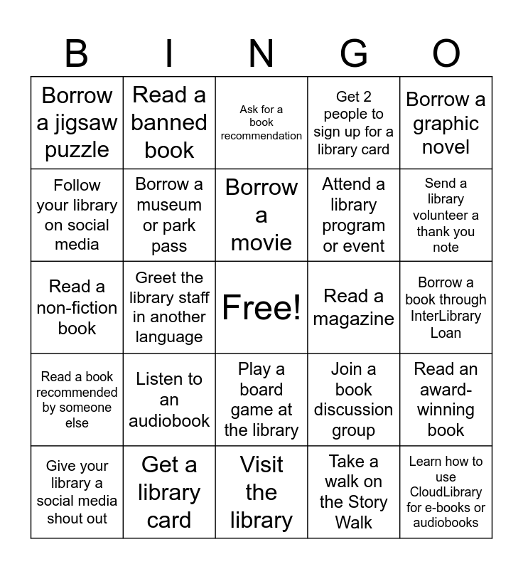 This bingo card has a free space and 24 words: Listen to an audiobook, Get a library card, Borrow a movie, Give your library a social media shout out, Borrow a graphic novel, Borrow a jigsaw puzzle, Follow your library on social media, Read a banned book, Read a magazine, Play a board game at the library, Attend a library program or event, Read a non-fiction book, Join a book discussion group, Read an award- winning book, Borrow a museum or park pass, Take a walk on the Story Walk, Borrow a book through InterLibrary Loan, Ask for a book recommendation, Send a library volunteer a thank you note, Greet the library staff in another language, Learn how to use CloudLibrary for e-books or audiobooks, Read a book recommended by someone else, Get 2 people to sign up for a library card and Visit the library.