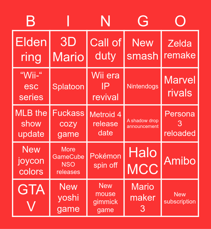 This bingo card has a free space and 34 words: Animal crossing, Mario maker 3, Final fantasy 7 remake release date, Cooking mama, New joycon colors, Splatoon, Zelda remake, GTA V, 3D Mario, Mario kart dlc/update, Wii era IP revival, Call of duty, Luigi’s mansion 4, Mario sports game, A shadow drop announcement, Marvel rivals, New yoshi game, MLB the show update, More GameCube NSO releases, Halo MCC, Pokémon spin off, Switch sports 2, Elden ring, Persona 3 reloaded, New mouse gimmick game, New subscription, New smash, New IP, Nintendogs, “Wii-“ esc series, BG3, Fuckass cozy game, Amibo and Tomodachi life mention.