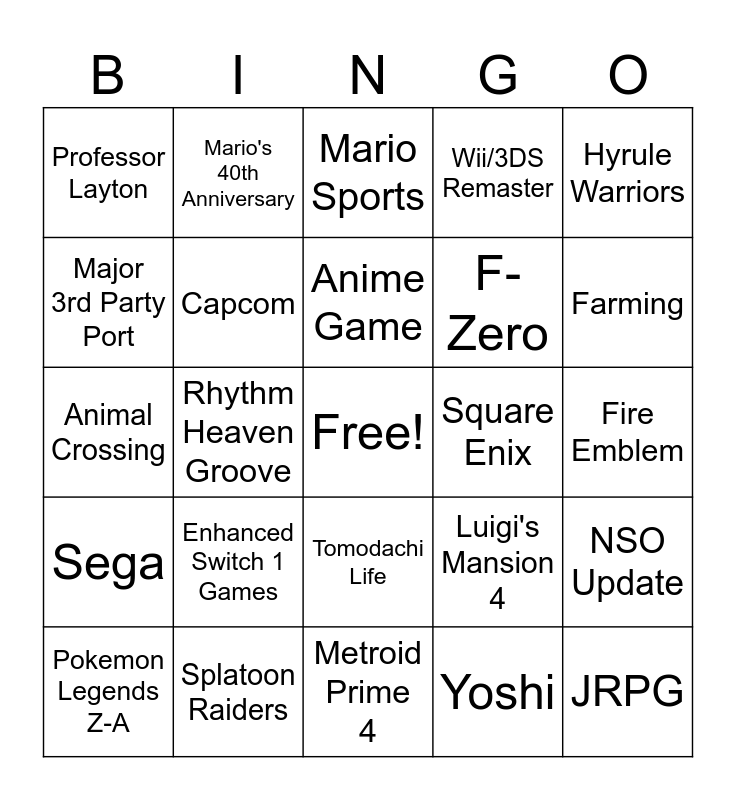 This bingo card has a free space and 24 words: Enhanced Switch 1 Games, Splatoon Raiders, Anime Game, Pokemon Legends Z-A, Hyrule Warriors, Professor Layton, Major 3rd Party Port, Mario's 40th Anniversary, Square Enix, Tomodachi Life, F-Zero, Animal Crossing, Luigi's Mansion 4, NSO Update, Capcom, Yoshi, Fire Emblem, Mario Sports, Farming, Rhythm Heaven Groove, JRPG, Sega, Wii/3DS Remaster and Metroid Prime 4.