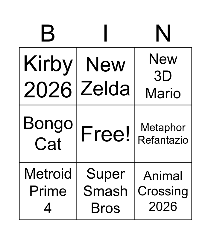 This bingo card has a free space and 8 words: Metaphor Refantazio, New 3D Mario, New Zelda, Metroid Prime 4, Kirby 2026, Animal Crossing 2026, Bongo Cat and Super Smash Bros.