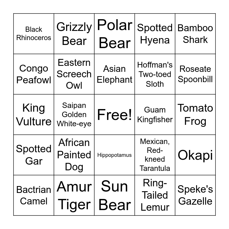 This bingo card has a free space and 24 words: African Painted Dog, Amur Tiger, Asian Elephant, Bactrian Camel, Bamboo Shark, Black Rhinoceros, Congo Peafowl, Grizzly Bear, Guam Kingfisher, Hippopotamus, Hoffman's Two-toed Sloth, King Vulture, Mexican, Red-kneed Tarantula, Okapi, Eastern Screech Owl, Ring-Tailed Lemur, Tomato Frog, Polar Bear, Roseate Spoonbill, Saipan Golden White-eye, Speke's Gazelle, Spotted Gar, Spotted Hyena and Sun Bear.