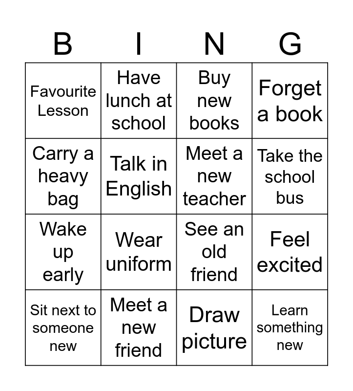 This bingo card has 16 words: Meet a new friend, Feel excited, Buy new books, Favourite Lesson, Wake up early, Have lunch at school, See an old friend, Draw picture, Carry a heavy bag, Talk in English, Sit next to someone new, Forget a book, Wear uniform, Take the school bus, Meet a new teacher and Learn something new.