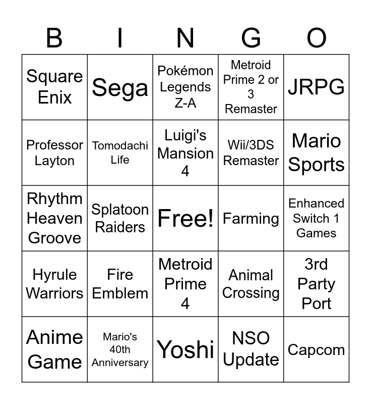 This bingo card has a free space and 24 words: Fire Emblem, Mario's 40th Anniversary, Luigi's Mansion 4, Anime Game, JRPG, Square Enix, Professor Layton, Sega, Farming, Metroid Prime 4, Wii/3DS Remaster, Rhythm Heaven Groove, Animal Crossing, 3rd Party Port, Tomodachi Life, NSO Update, Enhanced Switch 1 Games, Pokémon Legends Z-A, Mario Sports, Splatoon Raiders, Capcom, Hyrule Warriors, Metroid Prime 2 or 3 Remaster and Yoshi.