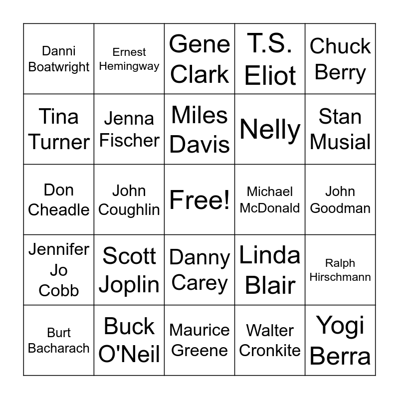 This bingo card has a free space and 24 words: Scott Joplin, Buck O'Neil, Miles Davis, Burt Bacharach, Chuck Berry, Danni Boatwright, Tina Turner, Ernest Hemingway, Michael McDonald, Danny Carey, Nelly, Don Cheadle, Linda Blair, Ralph Hirschmann, Jenna Fischer, Walter Cronkite, John Goodman, Gene Clark, Stan Musial, John Coughlin, Yogi Berra, Jennifer Jo Cobb, T.S. Eliot and Maurice Greene.