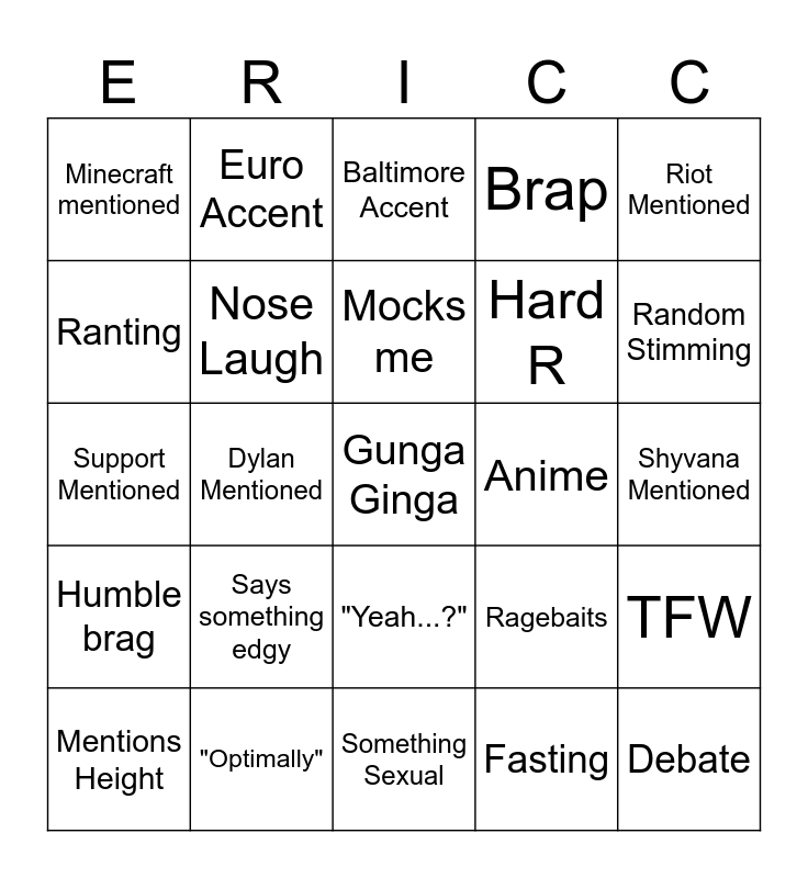 This bingo card has a free space and 24 words: Says something edgy, "Optimally", Mocks me, Mentions Height, Riot Mentioned, Minecraft mentioned, Ranting, Euro Accent, Anime, "Yeah...?", Hard R, Support Mentioned, Ragebaits, TFW, Nose Laugh, Fasting, Shyvana Mentioned, Baltimore Accent, Random Stimming, Dylan Mentioned, Debate, Humble brag, Brap and Something Sexual.