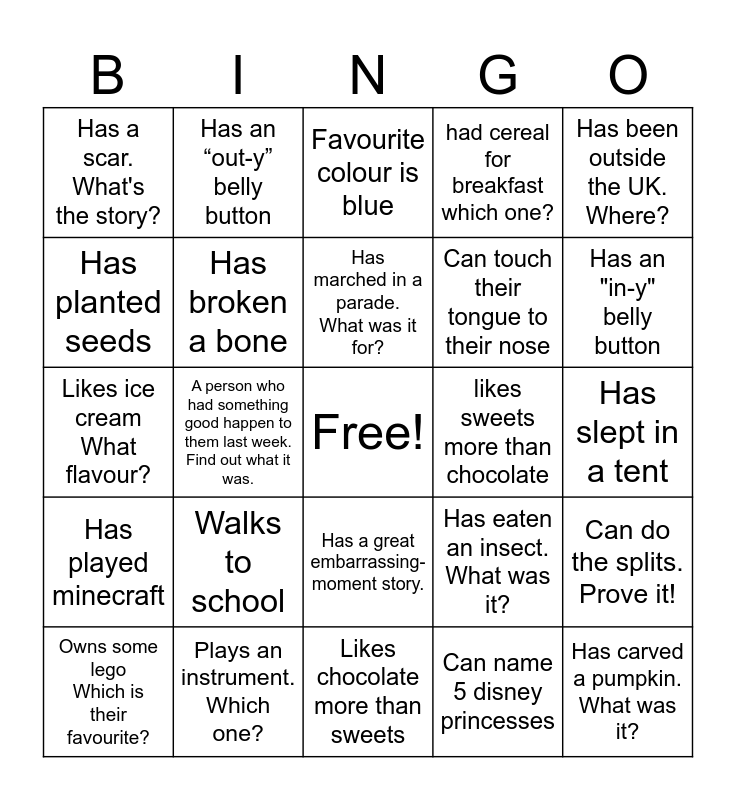 This bingo card has a free space and 24 words: Walks to school, Plays an instrument. Which one?, Has marched in a parade. What was it for?, Owns some lego Which is their favourite?, Has been outside the UK. Where?, Has a scar. What's the story?, Has planted seeds, Has an “out-y” belly button, likes sweets more than chocolate, Has a great embarrassing- moment story., Can touch their tongue to their nose, Likes ice cream What flavour?, Has eaten an insect. What was it?, Can do the splits. Prove it!, Has broken a bone, Can name 5 disney princesses, Has slept in a tent, Favourite colour is blue, Has an "in-y" belly button, A person who had something good happen to them last week. Find out what it was., Has carved a pumpkin. What was it?, Has played minecraft, had cereal for breakfast which one? and Likes chocolate more than sweets.