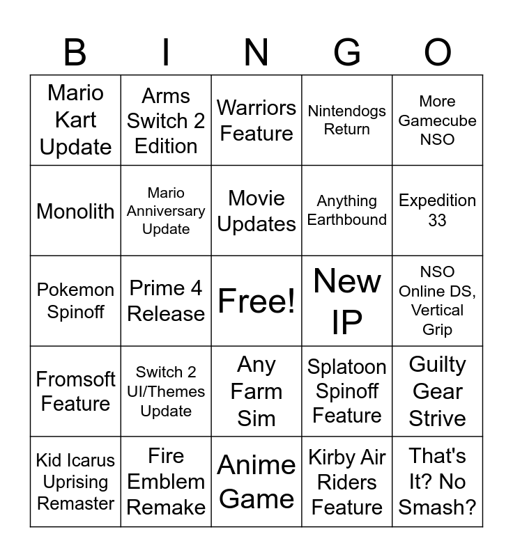 This bingo card has a free space and 24 words: Switch 2 UI/Themes Update, Fire Emblem Remake, Movie Updates, Kid Icarus Uprising Remaster, More Gamecube NSO, Mario Kart Update, Monolith, Arms Switch 2 Edition, New IP, Any Farm Sim, Anything Earthbound, Pokemon Spinoff, Splatoon Spinoff Feature, Guilty Gear Strive, Mario Anniversary Update, Kirby Air Riders Feature, NSO Online DS, Vertical Grip, Warriors Feature, Expedition 33, Prime 4 Release, That's It? No Smash?, Fromsoft Feature, Nintendogs Return and Anime Game.