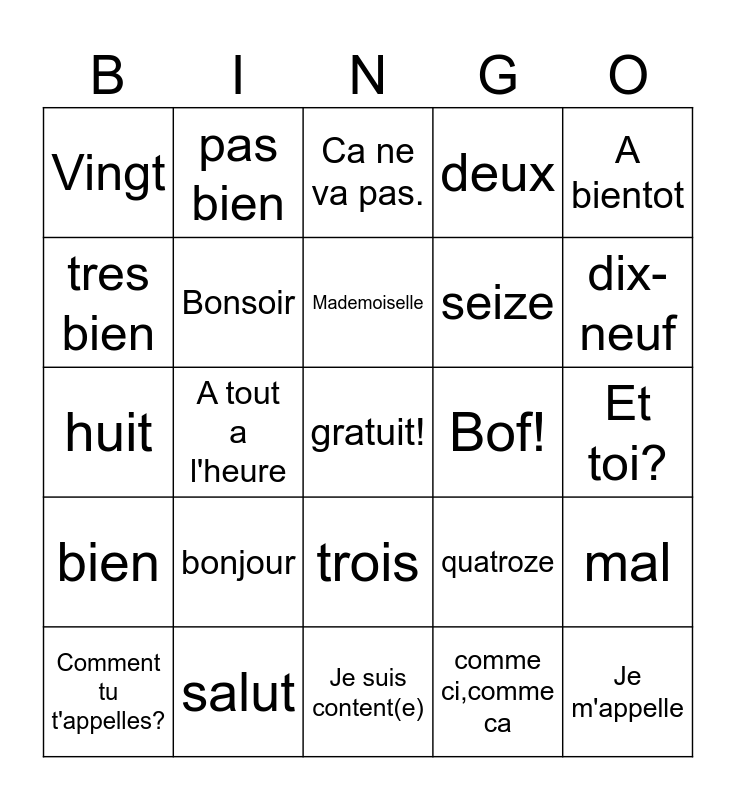 This bingo card has a free space and 24 words: bonjour, salut, Mademoiselle, Comment tu t'appelles?, A bientot, Vingt, tres bien, pas bien, Bof!, trois, seize, huit, quatroze, mal, Bonsoir, comme ci,comme ca, Et toi?, Ca ne va pas., dix-neuf, A tout a l'heure, Je m'appelle, bien, deux and Je suis content(e).