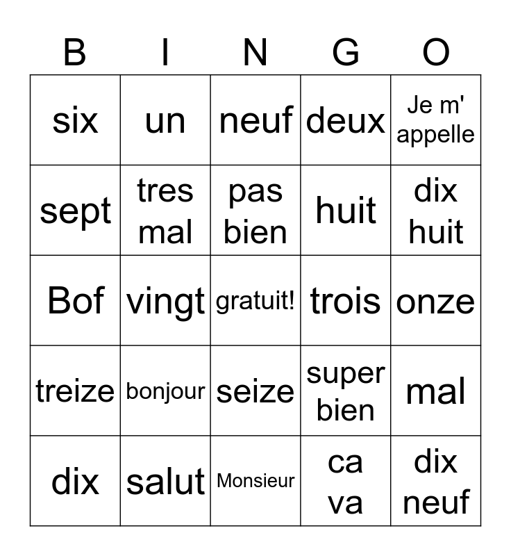 This bingo card has a free space and 24 words: bonjour, salut, pas bien, dix, Je m' appelle, six, sept, un, trois, seize, huit, Bof, super bien, mal, tres mal, ca va, onze, neuf, dix huit, vingt, dix neuf, treize, deux and Monsieur.
