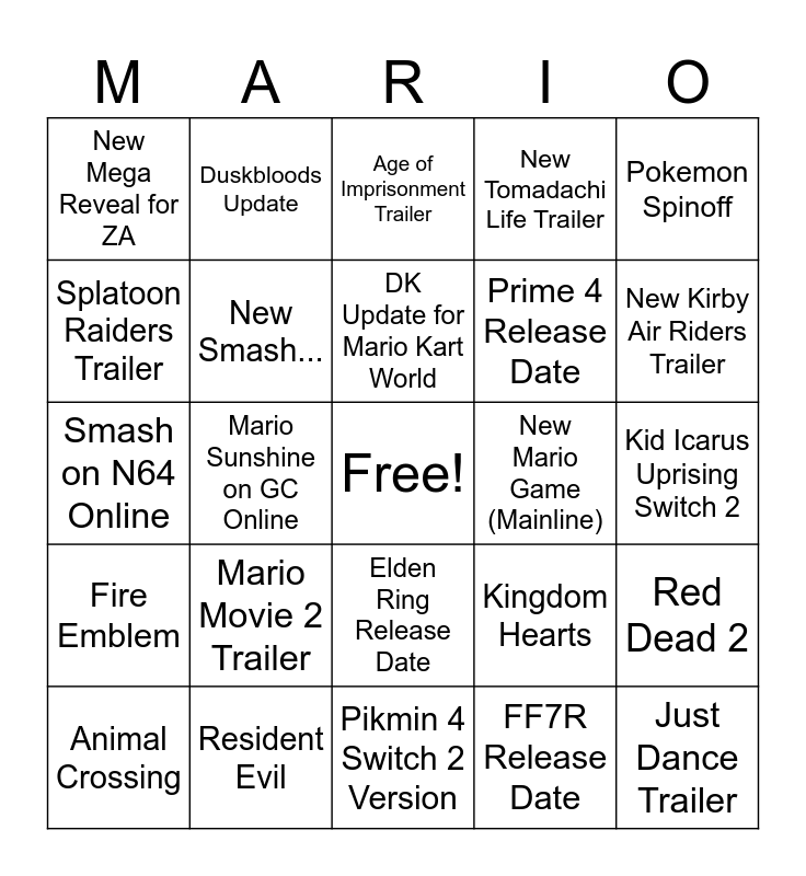 This bingo card has a free space and 24 words: Mario Movie 2 Trailer, Resident Evil, DK Update for Mario Kart World, Animal Crossing, Pokemon Spinoff, New Mega Reveal for ZA, Splatoon Raiders Trailer, Duskbloods Update, New Mario Game (Mainline), Elden Ring Release Date, Prime 4 Release Date, Smash on N64 Online, Kingdom Hearts, Red Dead 2, New Smash..., FF7R Release Date, Kid Icarus Uprising Switch 2, Age of Imprisonment Trailer, New Kirby Air Riders Trailer, Mario Sunshine on GC Online, Just Dance Trailer, Fire Emblem, New Tomadachi Life Trailer and Pikmin 4 Switch 2 Version.