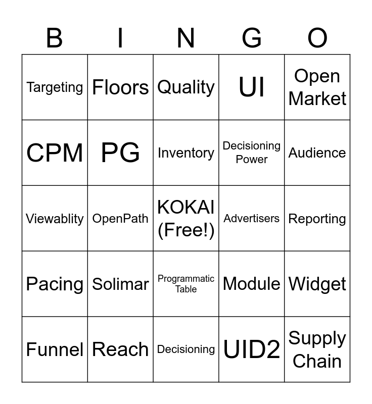 This bingo card has a free space and 49 words: Trader(s), Supply Chain, Milton Friedman, Decisioning, Solimar, Ventura, Floors, Duplication, CPM, PMP, PG, UI, Widget, Module, Revolutionize, Pickles, Inventory, Advertisers, Agencies, Open Market, OpenPath, UID2, Targeting, Decisioning Power, Constrained, Audience, Funnel, CTV, Programmatic Table, Pacing, Budget(s), Optimize, Innovation, Identity, Reach, Frequency, Seed(s), Forecasting, Reporting, S&P500+, Publishers, SSPs, Sellers, Deal Desk, Viewablity, Quality, Koa, Rails and Ad Group.