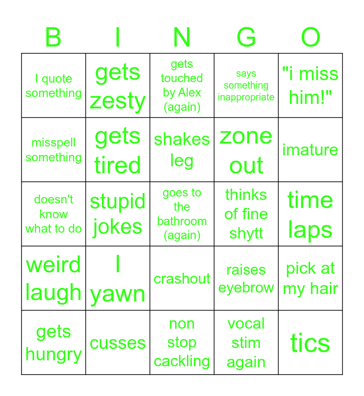 This bingo card has a free space and 24 words: I yawn, cusses, shakes leg, gets hungry, "i miss him!", I quote something, misspell something, gets zesty, thinks of fine shytt, crashout, zone out, doesn't know what to do, raises eyebrow, pick at my hair, gets tired, vocal stim again, time laps, gets touched by Alex (again), imature, stupid jokes, tics, weird laugh, says something inappropriate and non stop cackling.