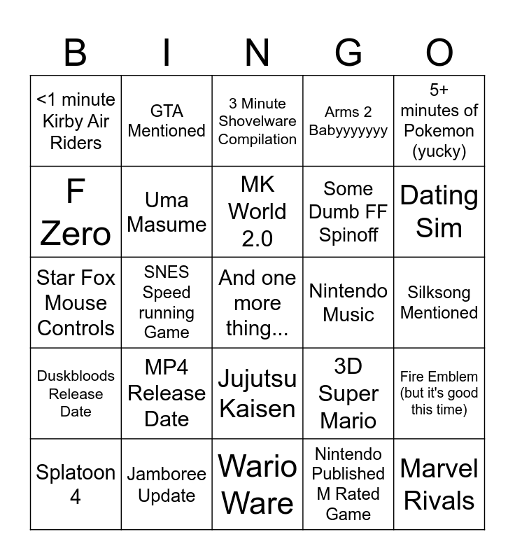 This bingo card has a free space and 24 words: MP4 Release Date, Jamboree Update, MK World 2.0, Splatoon 4, 5+ minutes of Pokemon (yucky), <1 minute Kirby Air Riders, F Zero, GTA Mentioned, Nintendo Music, Jujutsu Kaisen, Some Dumb FF Spinoff, Star Fox Mouse Controls, 3D Super Mario, Fire Emblem (but it's good this time), Uma Masume, Nintendo Published M Rated Game, Silksong Mentioned, 3 Minute Shovelware Compilation, Dating Sim, SNES Speed running Game, Marvel Rivals, Duskbloods Release Date, Arms 2 Babyyyyyyy and Wario Ware.