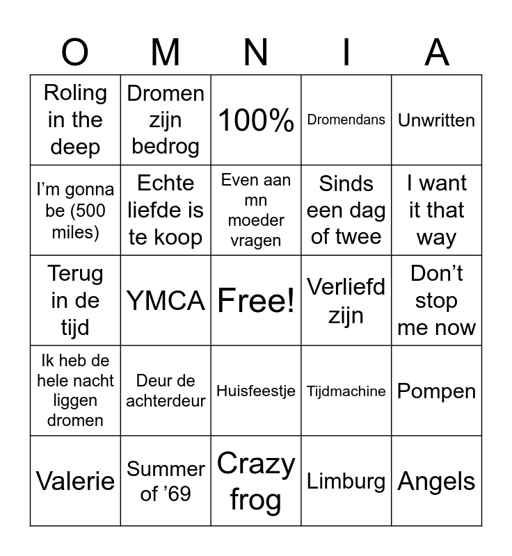 This bingo card has a free space and 75 words: Oya lélé, Gutenmorgen sonnenschein, 100%, Hey jude, Jan Klaassen de trompetter, Het regent zonnestralen, Brabant, Living on a prayer, Pianoman, Het dondert en het bliksemt, Country roads (remix), Per spoor (kedeng, kedeng), Even aan mn moeder vragen, I’m gonna be (500 miles), Wannabe, YMCA, Kali, Angels, Sweet caroline, Unwritten, Mannenharten, Terug in de tijd, Echte liefde is te koop, Dromen zijn bedrog, Dromendans, Als de morgen is gekomen, Bloed zweet en tranen, Atje voor de sfeer, Het is een nacht, Blijf je vanavond, Feesttent, 1001 nights, Laat de zon in je hart, Tijdmachine, I want it that way, Sinds een dag of twee, Ik wil je, Gimme, Gimme, Gimme, Don’t stop me now, Limburg, Sugardaddy, Have you ever been mellow, België, Sterrenstof, Best song ever, Stiekem gedanst, Valerie, Roling in the deep, Amalia, Zoet zout zuur, Summer nights, Huisfeestje, Maak me gek, Baila de Gasolina, Lotje, Turbo, Wackelkontakt, Blikkendag, Waarom nou niet, Mona Lisa, Deur de achterdeur, Vergeate, Kryptonite, Take on me, Relax, take it easy, Verliefd zijn, Bad, Levels, Dom, lomp en famous, Pompen, Ik heb de hele nacht liggen dromen, Summer of ’69, Amigo, Crazy frog and Dragostea din tei.
