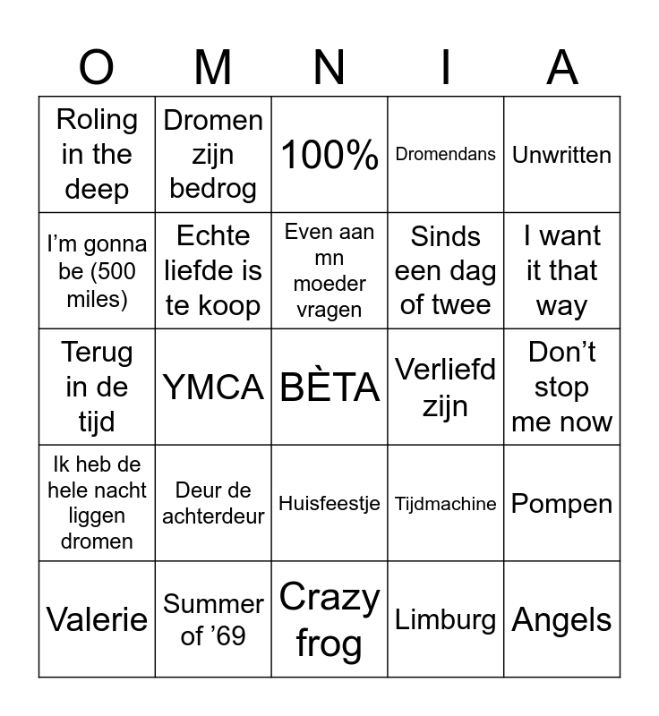 This bingo card has a free space and 75 words: Oya lélé, Gutenmorgen sonnenschein, 100%, Hey jude, Jan Klaassen de trompetter, Het regent zonnestralen, Brabant, Living on a prayer, Pianoman, Het dondert en het bliksemt, Country roads (remix), Per spoor (kedeng, kedeng), Even aan mn moeder vragen, I’m gonna be (500 miles), Wannabe, YMCA, Kali, Angels, Sweet caroline, Unwritten, Mannenharten, Terug in de tijd, Echte liefde is te koop, Dromen zijn bedrog, Dromendans, Als de morgen is gekomen, Bloed zweet en tranen, Atje voor de sfeer, Het is een nacht, Blijf je vanavond, Feesttent, 1001 nights, Laat de zon in je hart, Tijdmachine, I want it that way, Sinds een dag of twee, Ik wil je, Gimme, Gimme, Gimme, Don’t stop me now, Limburg, Sugardaddy, Have you ever been mellow, België, Sterrenstof, Best song ever, Stiekem gedanst, Valerie, Roling in the deep, Amalia, Zoet zout zuur, Summer nights, Huisfeestje, Maak me gek, Baila de Gasolina, Lotje, Turbo, Wackelkontakt, Blikkendag, Waarom nou niet, Mona Lisa, Deur de achterdeur, Vergeate, Kryptonite, Take on me, Relax, take it easy, Verliefd zijn, Bad, Levels, Dom, lomp en famous, Pompen, Ik heb de hele nacht liggen dromen, Summer of ’69, Amigo, Crazy frog and Dragostea din tei.