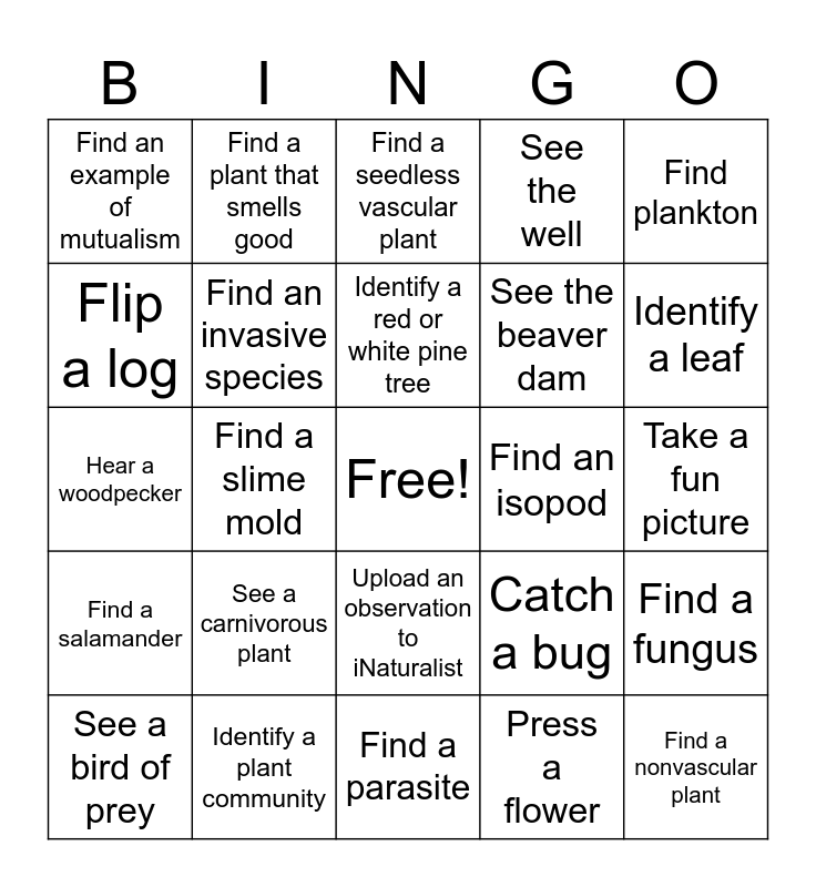 This bingo card has a free space and 24 words: See a carnivorous plant, Identify a plant community, Identify a red or white pine tree, See a bird of prey, Find plankton, Find an example of mutualism, Flip a log, Find a plant that smells good, Find an isopod, Upload an observation to iNaturalist, See the beaver dam, Hear a woodpecker, Catch a bug, Find a fungus, Find an invasive species, Press a flower, Take a fun picture, Find a seedless vascular plant, Identify a leaf, Find a slime mold, Find a nonvascular plant, Find a salamander, See the well and Find a parasite.