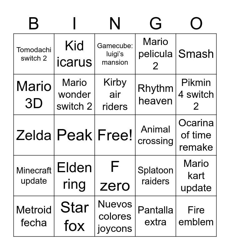 This bingo card has a free space and 24 words: Elden ring, Star fox, Kirby air riders, Metroid fecha, Smash, Tomodachi switch 2, Mario 3D, Kid icarus, Animal crossing, F zero, Rhythm heaven, Zelda, Splatoon raiders, Mario kart update, Mario wonder switch 2, Pantalla extra, Ocarina of time remake, Gamecube: luigi’s mansion, Pikmin 4 switch 2, Peak, Fire emblem, Minecraft update, Mario pelicula 2 and Nuevos colores joycons.