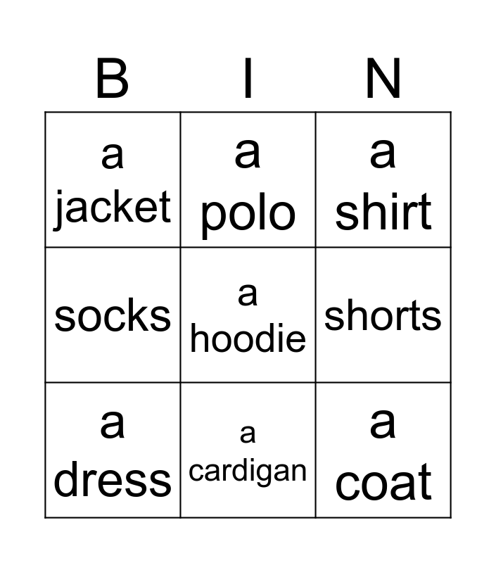 This bingo card has a free space and 11 words: a blouse, a cardigan, a coat, a dress, a polo, a shirt, shorts, a skirt, socks, a jacket and a suit.