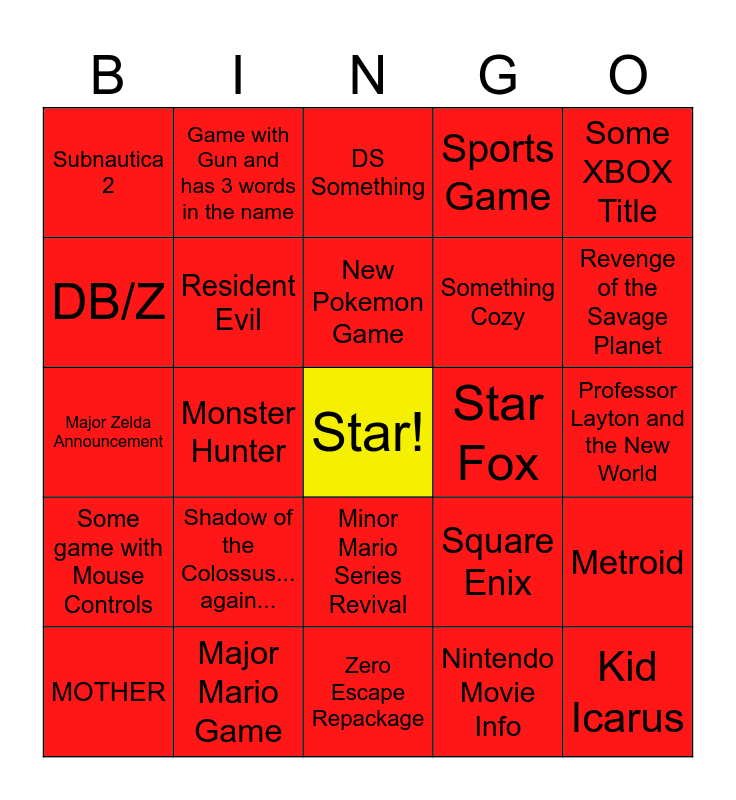 This bingo card has a free space and 24 words: Shadow of the Colossus... again..., Major Mario Game, New Pokemon Game, MOTHER, Some XBOX Title, Subnautica 2, DB/Z, Game with Gun and has 3 words in the name, Star Fox, Minor Mario Series Revival, Something Cozy, Major Zelda Announcement, Square Enix, Metroid, Resident Evil, Nintendo Movie Info, Professor Layton and the New World, DS Something, Revenge of the Savage Planet, Monster Hunter, Kid Icarus, Some game with Mouse Controls, Sports Game and Zero Escape Repackage.